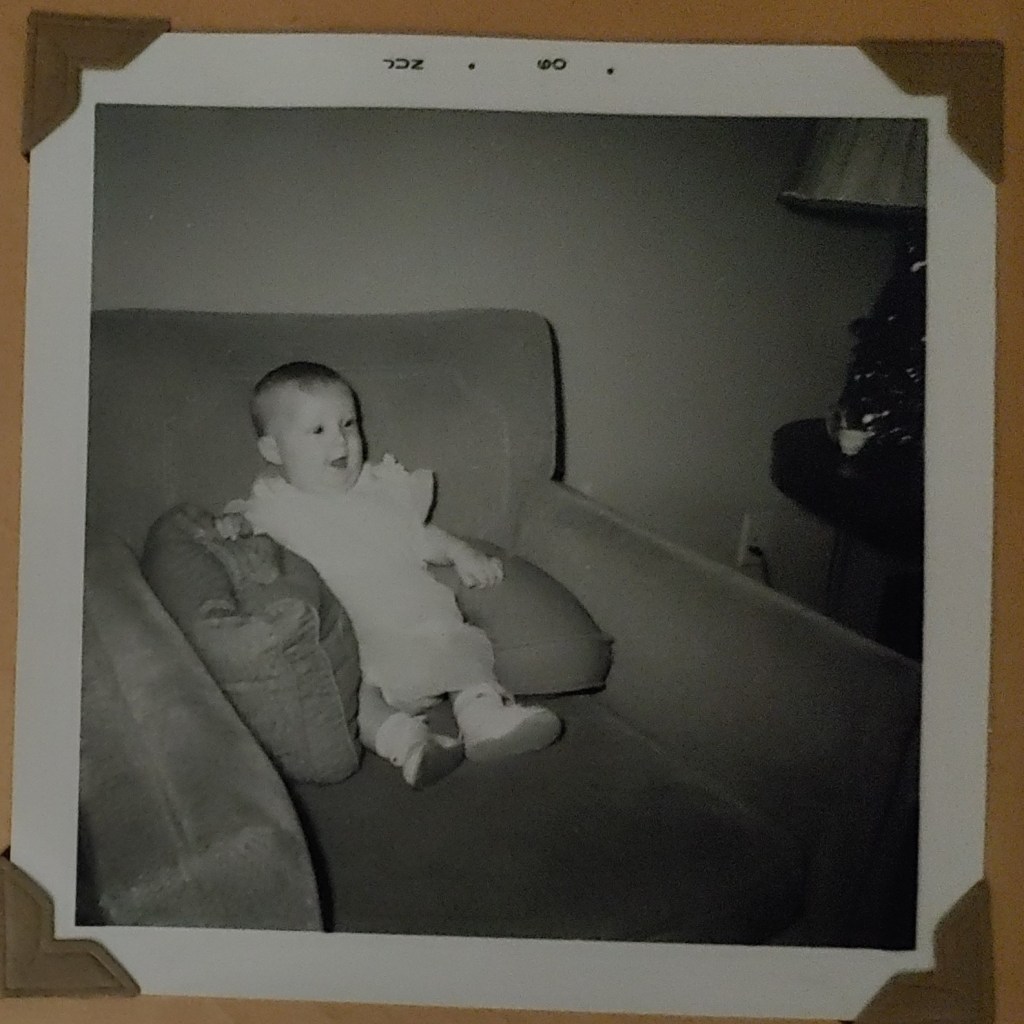 The carefully wrapped and packaged softcover scrapbook arrived on Saturday, and I slipped away to my office to devour its contents. I took in the farm-like setting depicted on the cover, noting the 25¢ price in the upper left corner. I carefully lifted the thin cover to find the first unlined page filled with a small, cursive, handwritten script that noted birth and early-life particulars for Penney—birth date and weight, feeding schedule, growth achievements, and progress notes. Two mentions of baby clothes received from the baby’s “real mother” at four months and six months of age. The diary-like summary captured the details that a “Baby Book” inquires after. It concluded with expressions of love for the baby the family had fostered for 7½ months. Fifteen pictures of a smiling baby were black-photo-cornered to the next three pages.